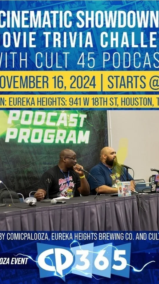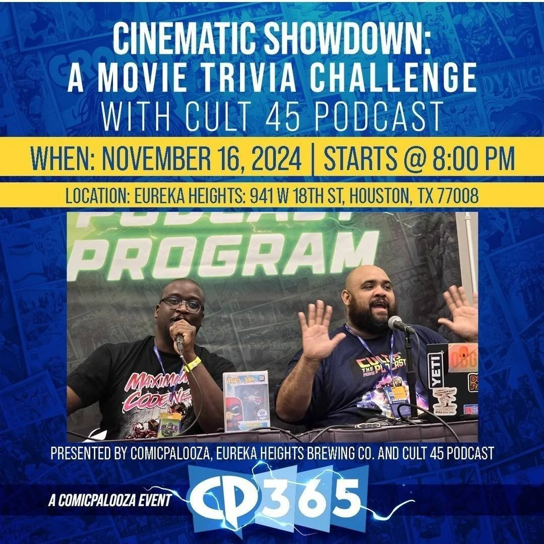 Join Cult45 Podcast for an epic Movie Trivia Night featuring five interactive rounds that will put your film knowledge to the ultimate test! From classic cinema to modern blockbusters, each round will challenge you with unique trivia styles, testing your memory, speed, and strategy. Compete with your team for a chance to win Comicpalooza badges for the top 3 teams of 4 players. Whether you're a casual fan or a die-hard movie buff, this night promises fun, competition, and plenty of movie magic!
